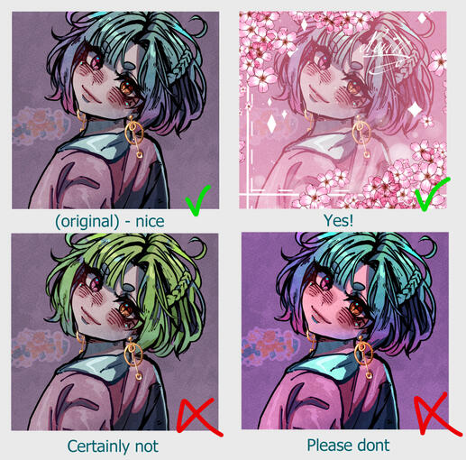 b) Alter the artwork in any way without my consent. This includes filters ***. If I provide a transparent PNG of your artwork you are allowed to use it for memes, background color changes, etc